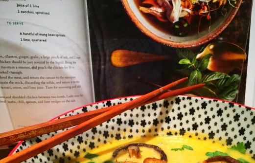 Soupe Thaïe aux crevettes et champignons Bouillon: 2 c. à soupe d'huile d'olive 1 poivron rouge en petits cubes 2 gousses d'ail hachées 3 cm de gingembre râpé 1 tige de citronnelle en tronçons 4 feuilles de lime kefir 2 boîtes de lait de coco 4 tasses de bouillon de poul [...]
