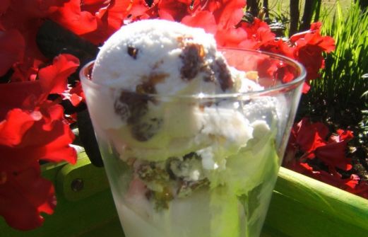 Crème glacée au rhum et raisins secs Recette pour : 900 ml "env" Préparation : 3 mn Glacer en sorbetière : 30 mn Il faut : 50 cl de crème anglaise froide " ou 500 g de fromage blanc battu pour une version allégée " 50 cl de crème fleurette épaisse 8 grosses càs de rhum blanc 120 g de raisins se [...]