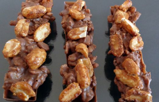 Des barres gourmandes remplies de chocolat au lait, riz soufflé, et arachides caramélisées. Croquant et croustillant .