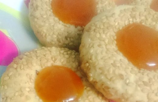 Ingrédients 250 g de margarine molle 1/2 verre d'huile 1 verre de sucre glace 1 paquet de levure chimique Vanille 2 oeufs Farine Graines de sésames Confiture d'abricot 1 dans un bol, travailler la margarine avec l'huile, le sucre glace , la levure, la vanille et l'œuf. Ajouter la farine progres [...]