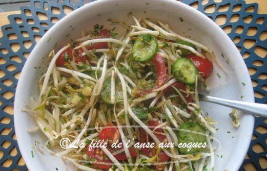 Récemment, je nous cuisinais un chow mein, et il m'est restée une bonne quantité de fèves germées. Qu'allais-je bien en faire? Je pouvais toujours nous cuisiner une salade chinoise, mais je n'avais pas tout ce qu'il me fallait. J''avais aussi envie d'aller vers une salade totalement différente [...]