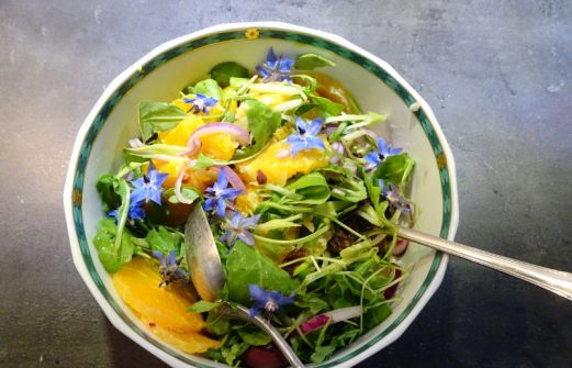 Ingrédients : 1 petite bulbe de fenouil 2 oranges une poignée de roquette 1/2 oignon rouge 25 g de raisins sultanas 25 g d'amandes grillées salées ma touche personnelle : quelques fleurs de bourrache ou autres fleurs comestibles Pour la vinaigrette : [...]