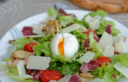 Préparation : 1 0 minutes Cuisson : 6 minutes Ingrédients (pour 4 personnes) : 1 salade( roquette ou feuille de chêne) 1 bouquet de basilic 250 gr de tomates cerises 4 oeufs extra frais 100 gr de grana padano Chiffonade de jambon [...]