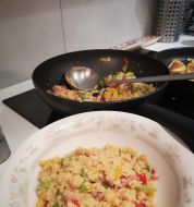 Verser l'huile d'olive et répartir de façon homogène sur la semoule.