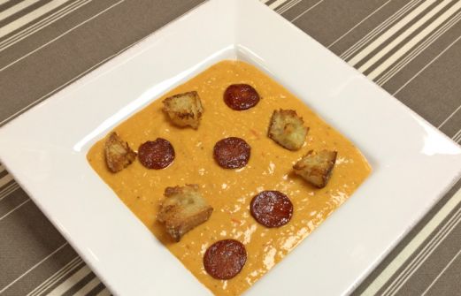 Je l’ai servi avec des croutons au parmesan maison et des chips de chorizo.