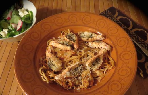 Parce que les langoustines se mangent généralement avec les doigts, il est peu pratique de les servir avec des pâtes. De là l’idée d’en décortiquer une partie pour les servir en sauce et d’en garder quelques-unes dans leur carapace, farcies d’un bon beurre à l’ail. [...]
