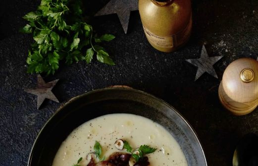 Velouté de persil tubéreux aux pommes, châtaignes , lard