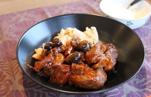 Une recette portugaise délicieuse qui peut se préparer à l'avance et être réchauffée le lendemain. La viande est alors meilleure car elle est restée dans la sauce toute la nuit. Le mélange olives noires, Porto, chorizo donne une sauce très parfumée. Ce plat est servi ici avec des pâtes semi-com [...]