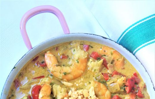En ce moment, gambas et haddock ont le vent en poupe à la maison, chacun ses envies ... Ingrédients 500 g de gambas 1 cs de pâte de curry 1 oignon 2 poivrons 1 gousse d'ail 40 cl de lait de coco 3 cs de coriandre fraîche 1 cs de cacahuètes grillées Huile d'olive Faire revenir à feu doux l'oigno [...]