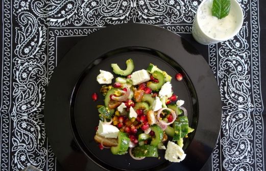 Une salade sucrée salée. Ingrédients : 2 concombre ½ grenade 2 càs de pistaches 100 g de dattes 1 échalote 1 gousse d'ail 4 càs d'huile d'olive 1 càs de jus de citron menthe fraîche 150 g de feta de brebis sel et poivre Pour la sauce : 1 yaourt grec de brebis huile d'olive sel et poivre me [...]