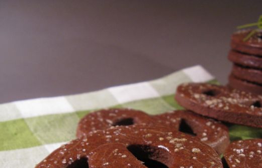 Ils n'ont de bretzels que la forme, parce que leur goût est vraiment très éloigné de cette spécialité alsacienne. Ces biscuits ne sont en fait ni plus ni moins que des sablés au chocolat, relevés d'une légère pointe de café . Le sucre cristallisé sur le dessus fait échos aux grains de s [...]