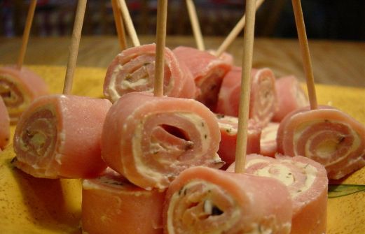 INGRÉDIENTS tranches de jambon pas trop fines fromage à tartiner ail et fines herbes tartiner de fromage les tranches de jambon les rouler serrées les envelopper dans du film plastique alimentaire et réfrigérer 2 heures couper en moreceaux d'un cm et mettre des piques