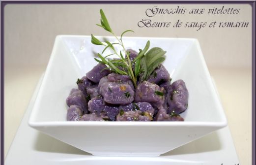 GNOCCHIS AUX VITELOTTES - BEURRE DE SAUGE ET ROMARIN Des gnocchis haut en couleur avec les vitelottes du jardin, ces pommes de terre sont très, très farineuses aux saveurs de châtaigne, pour les gnocchis, il faut un peu plus d'œuf et moins de farine, ceux-ci sont parfumés aux he [...]