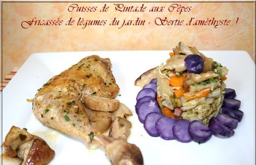CUISSES DE PINTADE AUX CÈPES RÔTIES AU FOUR Ici j' avais que des cuisses de pintade, plus rapide à cuire et surtout une cuisson plus homogène servis avec une fricassée de légumes du jardin Pour 4 personnes - 4 cuisses de pintade fermière - 15 cl de vin blanc "Riesling d'Als [...]