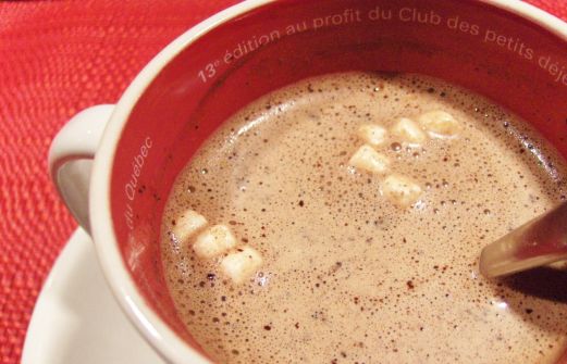 ...... ou comment combler une fringale très rapidement!!! Voilà, cela dit tout! Un très bon chocolat chaud maison, rapido-presto, avec seulement 3 ingrédients! Servi en plus dans une de mes nouvelles tasses pour soutenir la cause de la 13e édition du Club des petits déjeuners du Québec. [...]