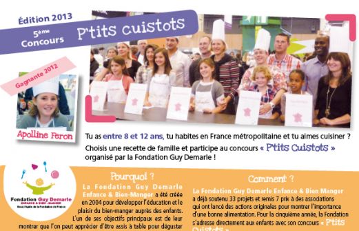 Les "P'tits cuistots" Tu as entre 8 et 12 ans ? Tu habites en France métropolitaine et tu aimes cuisiner ? Choisis une recette de famille et si possible à base de produits de ta région ou de saisons et participe au concours « P’tits cuistots » organisé par la Fondation Guy Demar [...]