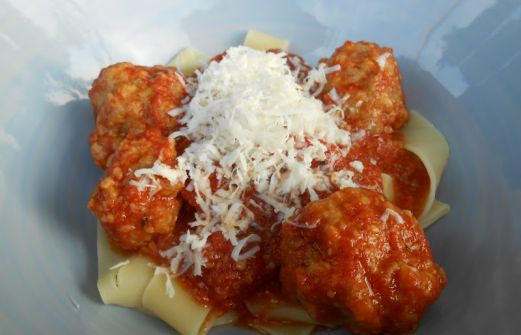 Toujours dans mon repas italien, voici donc le repas principal. De bonnes boulettes de veau dans une sauce tomate sur des parpadelles! Pour ce repas bien savoureux, je me suis procurée un bloc de Pecoriono chez Milano ainsi que des parpadelles et de la ricotta salata pour en garnir le tout. M [...]