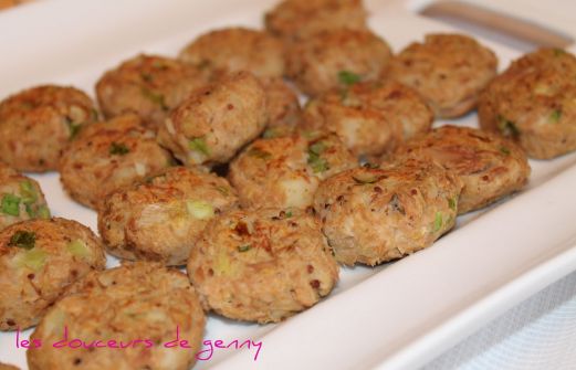 J'ai fait ces croquettes la veille de mon buffet et je les ai faites cuire le jour même ... MINIS CROQUETTES DE THON -1 grosse patates cuite, refroidie et pillée -2 btes de thon dans l'eau, égouttée -2 oignons verts hachés -1 c à soupe de moutarde de Dijon -zeste 1/2 citron -1 œuf -1 gouss [...]