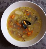 Préparation: 35 min Cuisson: 30 min Portions: 6 Ingrédients: 5 c.à thé d'huile d'olive 2 oignons verts, hachés 1 pomme de terre, coupée en dés 1 poivron vert, coupé en dés 2 carottes, coupées en rondelles 4 branches de céleri, avec les feuilles, coupées en dés 1/2 tasse de pois mange-tout co [...]