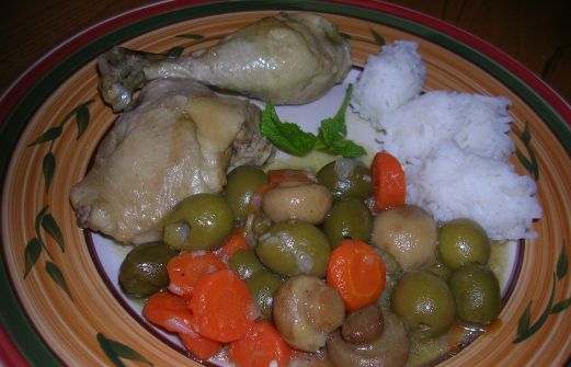 Des morceaux de poulet 1 oignon 3 gousses d'ail 3 carottes (facultatif) 1 petite boite de champignons de Paris entiers 200 g d'olives vertes dénoyautées 3 càs d'huile 1/2 càs de smen Sel, poivre, 1/4 càc de cannelle, 1/4 càc de gingembre, [...]