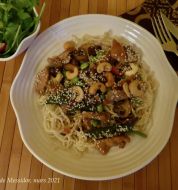 Ingrédients 1 lb de boeuf haché 3 gousses d’ail hachées 3 tasses de champignons tranchés 1 poivron rouge en dés 1 tasse de bouillon de boeuf 1/3 tasse de sauce hoisin 3 c. soupe de sauce soya 1 paquet de nouilles chinoises YET-CA-MEIN 1 c.à soupe de fécule de maïs 1 c.à sou [...]
