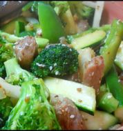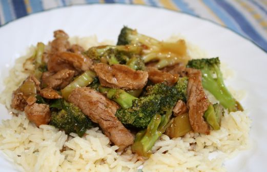 Sauce: 1/2 tasse de bouillon de poulet 1/4 tasse de sauce Hoisin 2 c. soupe de sauce soya 2 c. soupe de vinaigre de riz 1 c. thé de fécule de maïs Sauté: 2 c. soupe d'huile d'arachide 3/4 lb. de filet de porc coupé en fines lanières 3 oignons verts tranchés pour la garniture (le vert [...]