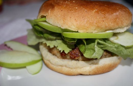 1 lb. de boeuf,de porc ou de veau haché 1/2 tasse de compote de pommes non-sucrée 1/2 tasse chapelure de pain frais 1 oeuf 1 tasse de cheddar fort râpé 4 gros pain kaiser ou à hamburger moutarde de dijon mayonnaise 1 pomme verte 2 oignon verts émincés Dans un bol, mé [...]