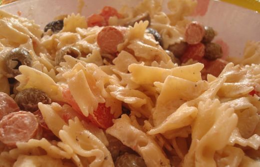 Voici une idée de salade sympa : la salade de pâtes agrémentée. Ingrédients : pâtes, olives, tomates, saucisses de Strasbourg Le plus d'Elo pour cette salade est la sauce aioli. Cela relève tout le goût de la salade :) A tester !