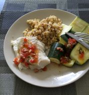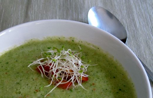 Soupe verte à la courgette et poivron rouge toute simple. Un peu d'ail, fleur de sel, poivre et une pincée du piment de cayenne.