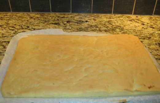 Le gâteau est sur la grille pour tiédir, il ne faut pas qu'il soit complètement froid. On le renverse sur un linge à vaisselle (propre naturellement) et on enlève doucement le papier parchemin Et puis à l'aide du linge on le roule bien. Une fois roulé on peut le laisser repose [...]