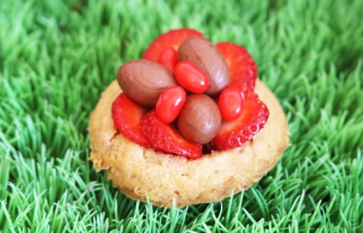 Prenez votre gâteau préféré, mettez-le à cuire dans un mini-moule en couronne (j'ai acheté une partie des miens chez Geneviève Lethu et l'autre dans un coffret-baba au rhum), démoulez-le et décorez-le avec des fruits, des bonbons... mais surtout des œufs de Pâques !