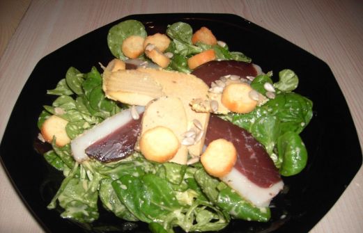 Une salade composée, un vrai régal ! Aujourdhui j'ai envie d'une assiette avec de bon produits. Un lit de salade, sur lequel je dépose des tranches de magret séchet maison, de beaux morceaux de foie gras de canard quelques croutons, pour le croquant et je parséme de pignons de pin [...]