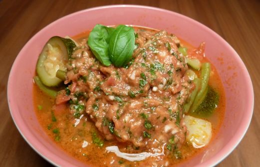 (pour 4 pers.) 2 grosses pommes de terre, pelées et coupées en morceaux 1 morceau de céleri-rave, coupé en cubes 300 g de haricots verts, frais ou surgelés 1 grosse tomate, pelée et coupée en morceaux 1 gros oignon, haché 2 gousses d'ail, coupées en 2 1 boite de haricots mé [...]