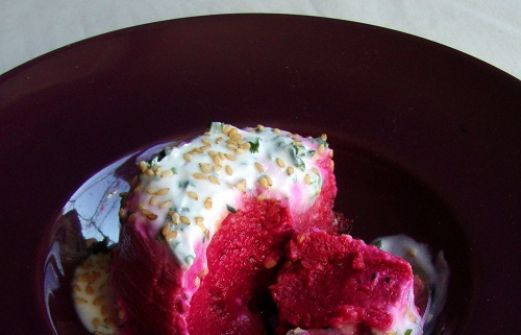 Ingrédients pour 4 personnes : Pour les flans : 2 grosses betteraves cuites 3 œufs 10cl de lait 10cl de crème liquide 40g de farine 1 cuillère à soupe bombée de purée de sésame complète (tahin) Sel Poivre (graines de sésame doré pour la déco) Pour la sauce : [...]