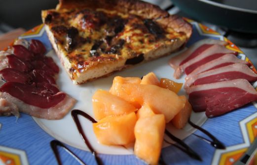 Voici une petit menu estival et festif ! Après des petits canapé de paté d'oie à l'armagnac sur des croquants à la figue, j'ai servi une tarte chêvre - pruneaux - lardons, accompagnée de magrets de canard fumé, et de cubes de melon chauds caramélisés dans du sucre et du jus de citron. Fort inh [...]