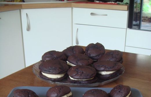 Pour la garniture: 250g de mascarpone 90g de sucre 3 grosses cuillères à soupe d'extrait de vanille Bien mélanger les ingrédients puis réserver au frigo pendant la préparation des coques. Pour les coques: 250g de farine 75g de cacao non sucré 1 c. à c. de bicarbonat [...]