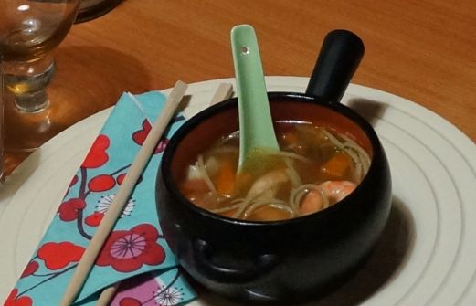 Pour 6 personnes Ingrédients : - 50g de nouilles soba au thé vert - 2 petites carottes - 24 crevettes - 1 oignon - 1/2 cuillère a café d'ail déshydraté - 4 brin de coriandre fraiche - 6 brin de ciboulette fraiche - 50g de chanterelles fraiche - 1 plaquette d [...]
