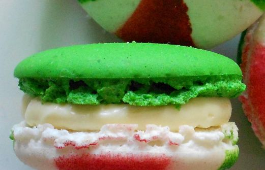 De jolis macarons pour la période des fêtes. La coque blanche du dessus a été colorée au airbrush pour donner un look de bonbon. Ils sont garnis de crème au beurre parfumée à la menthe poivrée.