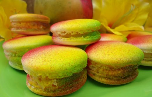 Ils sont hauts en couleurs, ces macarons sont garnis d'une ganache au chocolat blanc parfumée au thé Oolong et à la mangue. Un petit goût frais et juste assez fruité.