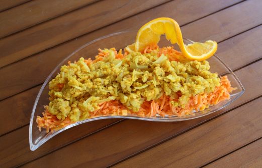 Pour 4 personnes: 100g de lentilles corail 4 carottes 1 petit oignon 1 cuillère à soupe d'huile d'olive 1 cuillère à café de curcuma 1 pointe de couteau de 4 épices 1/2 citron jaune 100g de mimolette râpée Vinaigrette: 1/2 citron jaune 1 orange 1 cuillère à café de miel [...]