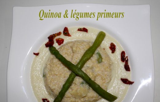 Pour 4 personnes: 200g de quinoa 1L de bouillon de légumes 15cl de vin blanc sec 1 échalote 100g d'asperges 10 coeurs d'artichaut 20g+50g de parmesan râpé 25cl de crème liquide 50g de fromage frais type St Morêt huile d'olive poivre 4 tomates séchées Préparer la cr [...]