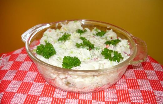 4 tasses de pommes de terre cuites, refroidies et coupées en cube 1/2 tasse de vraie mayonnaise 4 c. à table comble de crème sûre 1/4 tasse de poivron rouge 1/4 tasse de poivron vert 4 oignons verts coupés finement 5 radis coupés finement 2c. à table de persil frais coupé finement Sel e [...]