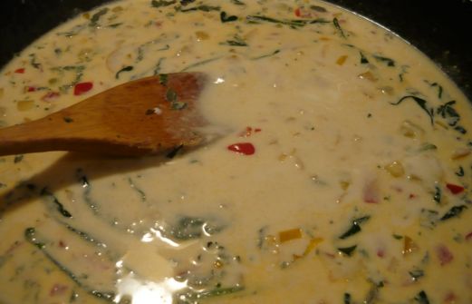 3/4 tasse de lait 1/2 tasse de crème 1 oignon moyen coupé fin 1/4 tasse de poivron rouge coupé fin 1/4 tasse de poivron vert coupé fin 1/4 tasse de poivron jaune coupé fin 1/2 tasse de bébés épinards 1 gousse d'ail tranché au presse-ail 1/4 [...]