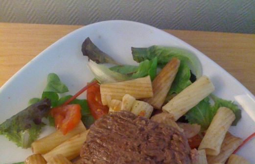Pour 2 personnes 9 propoints par personne 2 steaks hâchés à 5% 1 cc d'huile d'olive 200g de pâtes cuites froides 20g de gruyère salade Faire chauffer l'huile d'olive dans une poêle et y faire cuire les steaks. Saler, poivrer. Les couper en deux dans le sens de la largeur et les fa [...]
