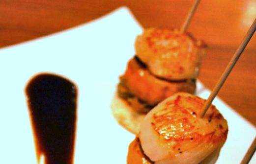 Un canapé Toasté, un confit d'oignons, un escalope de foie gras poêlée, une noix de saint Jacques, le tout accompagné d'un jus corsé au vinaigre balsamique...