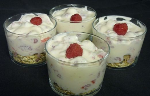 ingrédients pour 4 : 3 yaourts à la grecque, 2 cuillères à soupe de miel, 100 g de muesli, 350 g de framboises Mets le muesli dans les 4 verrines Mélange les yaourts et le miel en fouettant Ajoute les framboises délicatement (sans les écraser) Verse le tout dans les verrines Déguste [...]