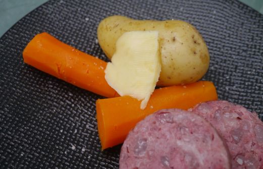 Aujourd'hui, je vous présente un produit de ma région d'adoption: Le sabodet . Pour ceux qui ne connaissent pas, c'est un gros saucisson à cuire, composé de différentes parties de la tête de porc. Un plat parfait pour l'hiver, que j'ai accompagné de pommes de terre et de carottes à la fleur d [...]
