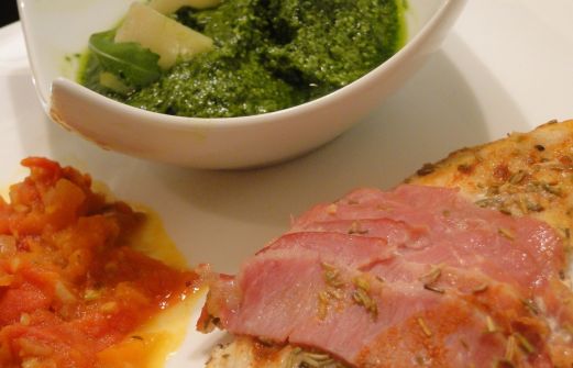 Crème de tomate Ingrédients Tomates Ail Oignons persil Curry Filets de pangas Marinade avec Piment d'espelette, jus de citron, romarin. Enrober de Bacon Pesto de roquette Roquette - environ 70 gr Huile d'olive Noix Pa [...]