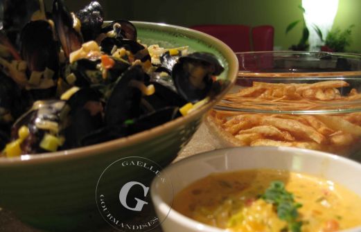 Pour 2 à 3 personnes : 2.700 Kg de moules 2 échalotes 1 oignon 1 poireau 2 carottes 3 branches de céleris 5 champignons de paris 2 tomates 2 cuillères à soupe de concentré de tomate 0.150 Kg de lardons 1 branche de thym Persil 350 mL de crème liquide 0.040 Kg de beurre Un [...]