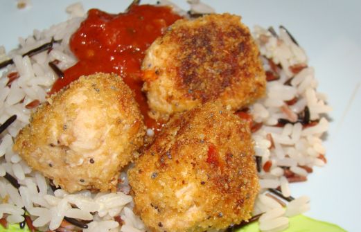 Pour 2-3 personnes : - 2 escalopes de poulet ; - 1 pot de sauce Sacla tomates cerises menthe ; - 1 oeuf ; - chapelure ; - graines de pavot ; - sel. Faire revenir les escalopes dans une poêle. Les retirer du feu quand elles sont dorées. Les couper et les placer dans le mixer. Mi [...]